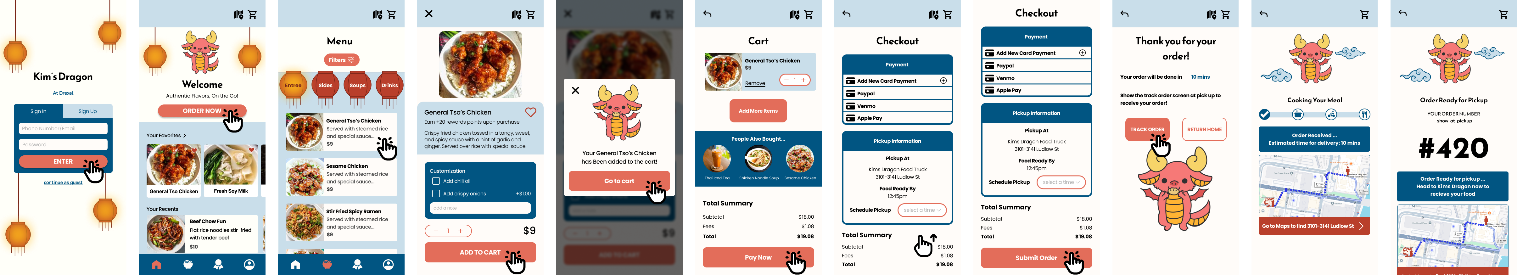 Kim’s Dragon, a popular food truck at the heart of the Drexel campus is known for serving Chinese cuisines. We chose to continue the Kim’s Dragon food truck design due to its simple layout with the inclusion of the distinct graphics that makes it stand out in creativity. Even without a digital ordering system, they are fast, efficient, and cheap making it a favorable lunch option for students, university staff, and nearby workers. For the new app featuring the full development, we wanted to carry on the designs from the previous class, but also add finishing touches backed by user testing.