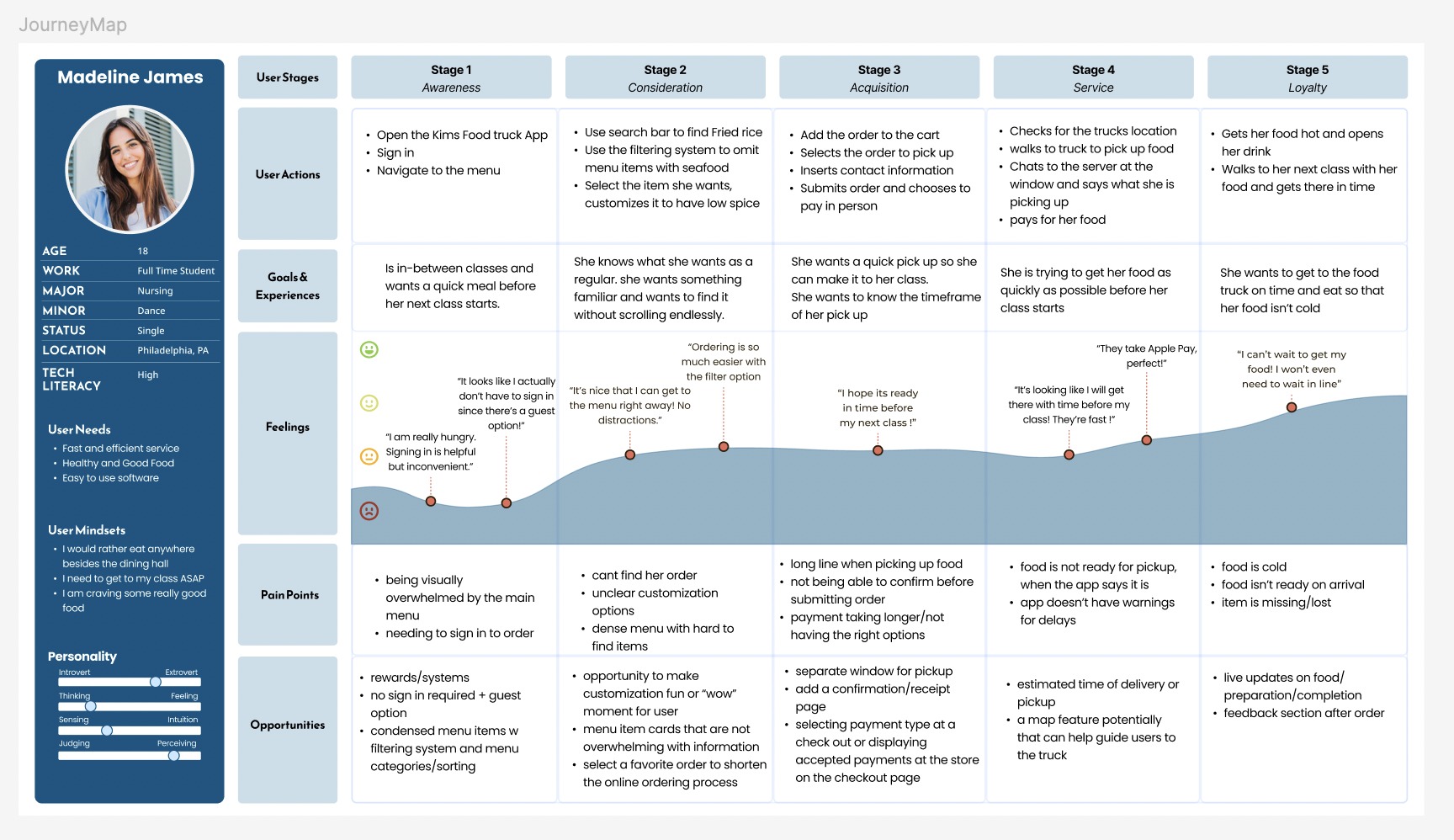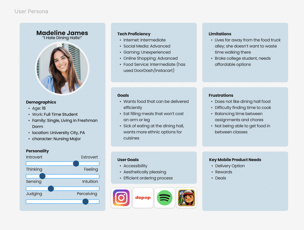 For much of our design and audience research, we were able to refer to IDM215 for the information. Here we have Madeline James, who represents the average college student struggling to find an affordable and accessible meal between her busy schedule.